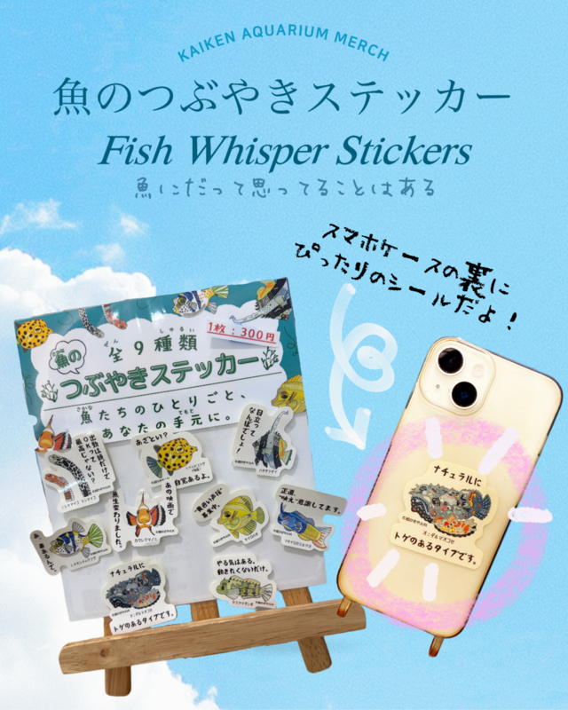 いらすと屋JUNさん × 「KAIKENのチイサナ水族館」コラボ商品。 魚のつぶやきステッカー(全9種)を【数量限定】で販売! JUNさんが描く愛らしい魚のイラストに、 「魚もこんなこと考えているのかも?」と思わず想像してしまう、かわいくもシュールで面白い魚のつぶやきステッカーをどうぞお買い求めください!